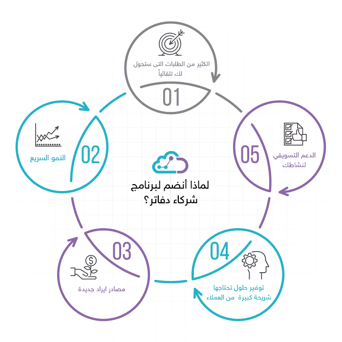افتح لك آفاقا جديدة لزيادة إيراداتك بالانضمام معنا في برنامج شركاء دفاتر. نحن نبحث باستمرار عن شركاء توزيع متخصصين، فإذا كنت أحد الشركات المتخصصة في تقديم حلول الأعمال الصغيرة، كأجهزة نقاط البيع، أجهزة الحضور والانصراف، أجهزة الحاسب الآلي والشبكات أو تلك المتخصصة في الحلول السحابية فسنسعد بالحديث معك واستكشاف فرص النمو سويا.