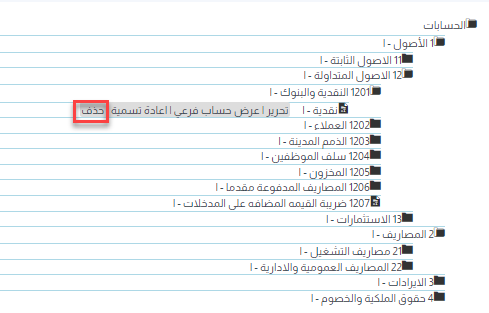 3- حذف حساب: افتح دليل الحسابات وحدد الحساب المطلوب حذفه. وتأكد من عدم ارتباط الحساب بعمليات مسجلة بالإضافة إلى عدم وجود حسابات فرعية له.