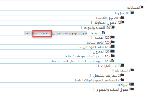 4- تغيير اسم حساب: افتح دليل الحسابات واختر الحساب الذي تريد تغيير اسمه واضغط على “إعادة تسمية” ثم اكتب الاسم الجديد.