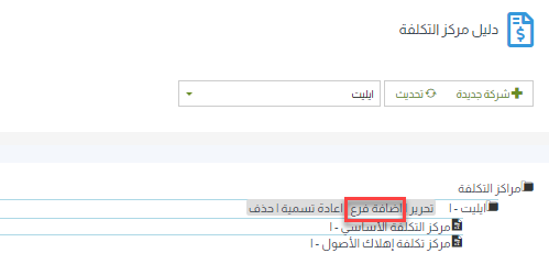 1- إضافة مركز تكلفة: ادخل على مجموعة مركز التكلفة التي تريد إضافة مركز فرعي لها، ثم اضغط على “إضافة فرع” ثم حدد اسم مركز التكلفة.