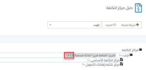 2- حذف مركز تكلفة: افتح دليل مراكز التكلفة وحدد مركز التكلفة الذي تريد حذفه. وتأكد من عدم ارتباطه بعمليات مسجلة أو عدم وجود مراكز تكلفة فرعية له.