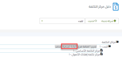 3- تغيير اسم مركز تكلفة: افتح دليل مراكز التكلفة واختر مركز التكلفة الذي تريد تغيير اسمه، ثم اضغط على “إعادة تسمية” واكتب الاسم الجديد.