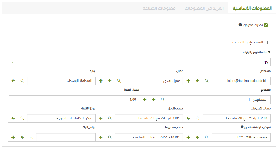 • مركز التكلفة: ادخل مركز التكلفة المرتبط بنقطة البيع وعادة هو مركز التكلفة الاساسي.