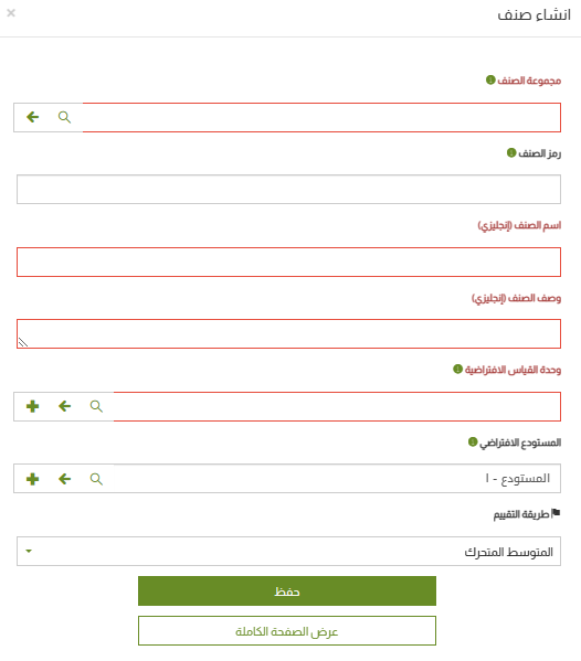 • عرض الصفحة كاملة: انقر على هذا الزر؛ إذا كنت تريد الانتقال إلى الصفحة الخاصة بتسجيل بيانات الصنف.