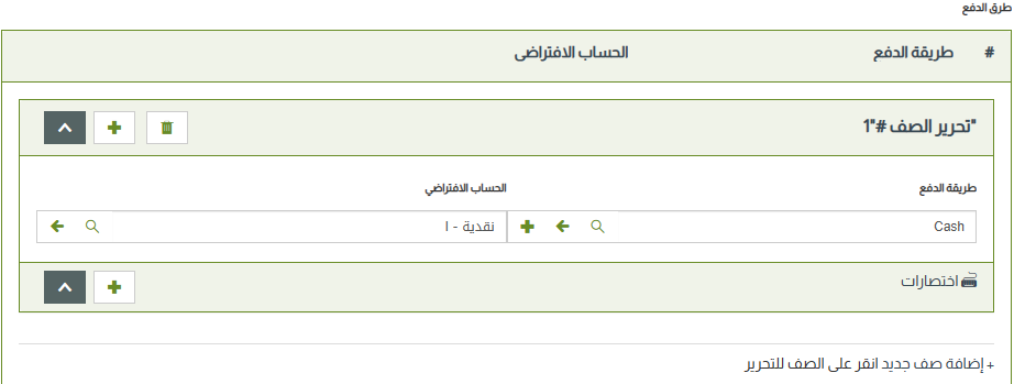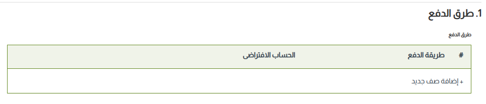 3- ادخل طرق الدفع التي تريد استخدامها في نقطة البيع التي تقوم بإعدادها، بالنقر على “إضافة صف جدبد” . علماً بأن طرق الدفع، ستظهر لك بشكل افتراضي ويمكنك أن تضيف لها أي طرق دفع أخرى تريدها