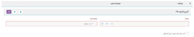 ملحوظة: يمكنك السماح لموظف محدد بتسجيل الحضور/الانصراف من موقع أخر غير الموقع المحدد لزملائه في القسم أو الشركة؛ من خلال النقر على زر “إضافة صف جديد” وإدخال الموظف والموقع الذي تريد تعيينه له. ويمكنك أيضاً السماح لهذا الموظف بتسجيل الحضور/الانصراف من أي موقع حتى وإن كان خارج النطاق المحدد؛ بالتأشير داخل مربع “السماح بالحضور خارج النطاق”. - انقر على زر “حفظ”، الموجود أعلى الشاشة؛ لتحفظ البيانات التي ادخلتها في الخطوة السابقة.