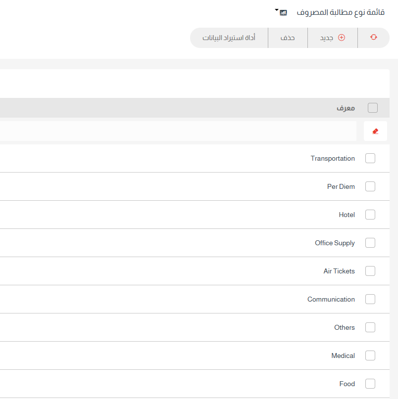تستخدم تلك الواجهة فى ادخال انواع مطالبة المصروف و التى تمثل بنود المصروفات التى تتيح الشركة لموظفيها ان تطالبها بالمصاريف التى صرفت تحت مسمى تلك البنود مثل (مصاريف مواصلات – شراء ادوات مكتبيه – مكالمات تليفونية … إلخ) و ذلك من خلال الضغط على زر جديد المتواجد فى واجهة قائمة نوع مطالبة المصروف