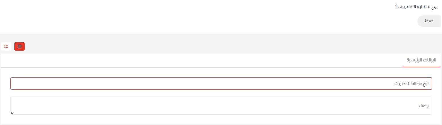بعد الضغط ستظهر الواجهة التاليه و التى تتيح للمستخدم ادخال انواع مطالبة المصروف من خلال حقل -نوع مطالبة المصروف – و ايضا هناك امكانية توصيف نوع المطالبه من خلال حقل -وصف- و بالضغط على زر حفظ الملون بالازرق بعد الانتهاء من ادخال البيانات يقوم النظام بحفظ نوع المطالبة داخل النظام
