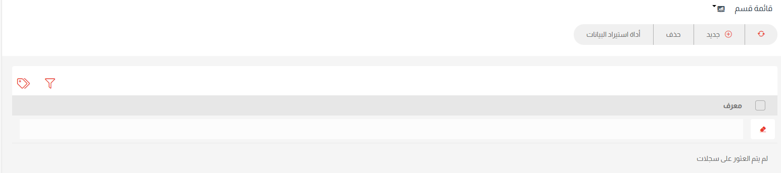 تستخدم تلك الواجهة فى ادخال اقسام الشركة المختلفة و المقصود بالاقسام هنا هى الاقسام الداخلية للشركة كــ(قسم الموارد البشرية – قسم الحسابات – قسم الانتاج – قسم المشتريات …. إلخ) و لذلك يتيح النظام للمستخدم ان يقوم بادخال تلك الاقسام و التعامل معها فى باقى شاشات النظام و منها للمساعده فى انشاء قسائم راتب لمجموعة معينه من الموظفين و منها التحديد بالقسم و لإدخال الاقسام يتم ذلك من خلال الضغط على زر جديد المتواجد فى واجهة قائمة قسم