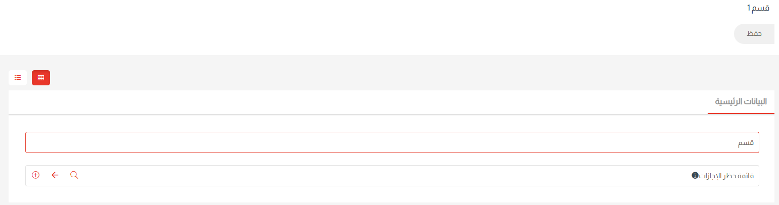 بعد الضغط ستظهر الواجهة التاليه و التى تتيح للمستخدم ادخال اسم القسم من خلال حقل -قسم- و هناك ايضا امكانية تحديد قائمة حظر اجازات لربطها بهذا القسم و التى يتم ادخالها من منطقة اعدادات الاجازات . و الهدف من ربط قائمة حظر الاجازات بقسم معين هو طبيعة هذا القسم التى لا تحتمل ان يتم طلب اجازة فى مده زمنية تعتبر ذات اهمية لتواجد هذا القسم مثال على ذلك : المستشفيات او قسم الانتاج فى احدى الشركات التى تنتج منتجات موسمية او قسم الحسابات فى الشهر السابق لإغلاق الميزانية …. إلخ و بعد الانتهاء من ادخال البيانات و بالضغط على زر حفظ الملون بالازرق يقوم النظام بحفظ القسم داخل النظام