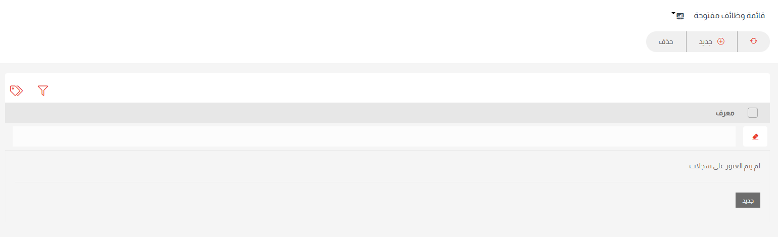 تستخدم تلك الواجهة فى ادخال مجموعة الوظائف المفتوحة و المتاحة من قبل المؤسسة و ذلك من خلال الضغط على زر جديد المتواجد فى واجهة قائمة الوظائف المفتوحة