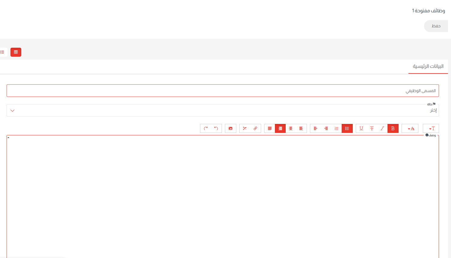 بعد الضغط ستظهر الواجهة التاليه و التى تتيح للمستخدم اضافة الوظائف من خلال حقل المسمى الوظيفى و تحديد حالتها ان كانت متاحة او مغلقة عن طريق القائمة المنسدلة المسماه بــ حالة مع امكانية ادخال التوصيف الوظيفى لها من خلال حقل وصف