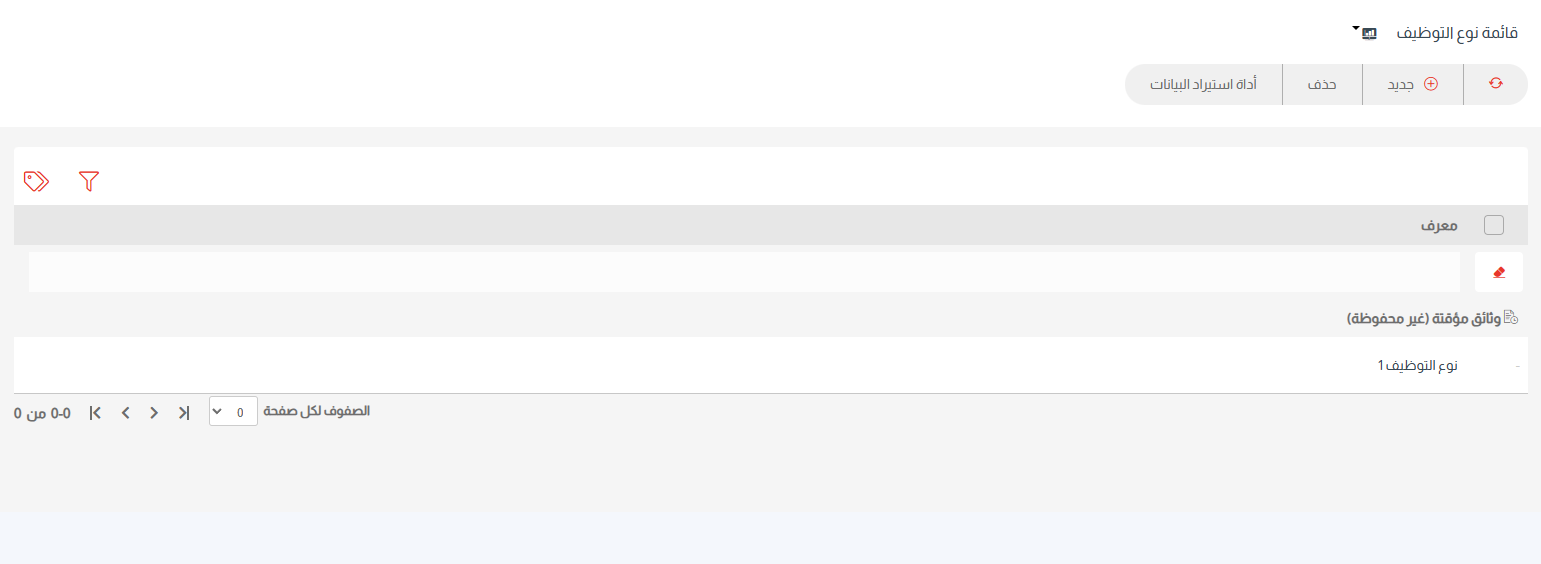 تستخدم تلك الواجهة فى ادخال انواع التعاقد المتاحة داخل المؤسسة مثل (دوام كامل – دوام جزئى – دوام محدد بالوقت …. الخ) و ذلك من خلال الضغط على زر جديد المتواجد فى واجهة قائمة نوع التوظيف