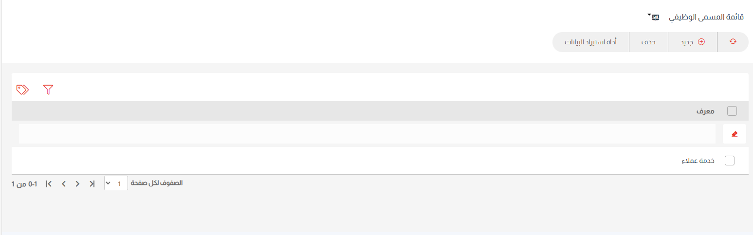 تستخدم تلك الواجهة فى ادخال المسميات الوظيفية المتاحة داخل المؤسسة مثل (مهندس – محاسب – محامى …. الخ) و ذلك من خلال الضغط على زر جديد المتواجد فى واجهة قائمة المسمى الوظيفى