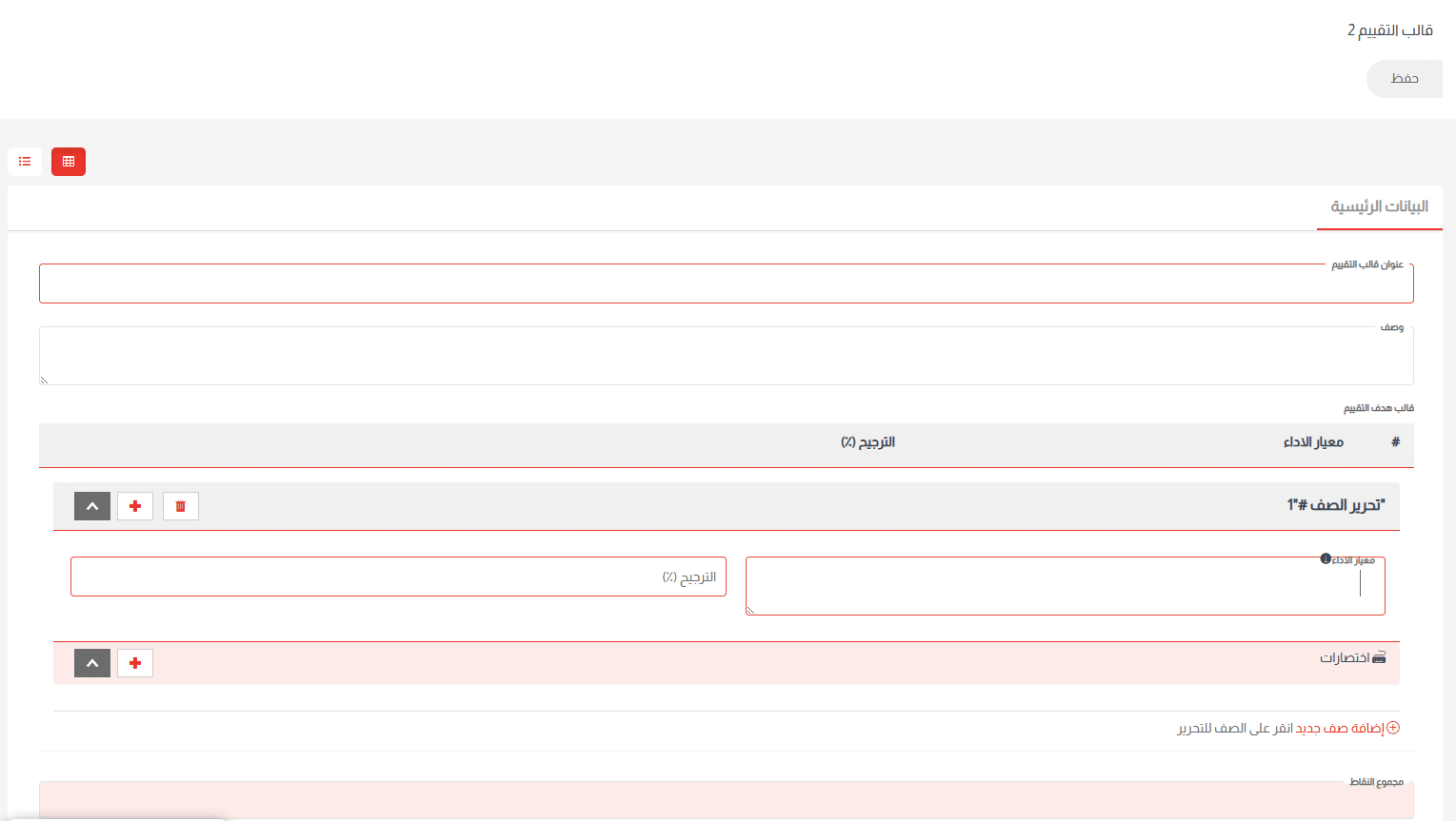 بعد الضغط ستظهر الواجهة التاليه و التى تتيح للمستخدم عنونة قالب التقييم من خلال حقل – عنوان قالب التقييم – و امكانية توصيف الغرض من هذا التقييم من خلال حقل – وصف – و ادخال اهداف التقييم و المعاملات بنسبها من خلال قالب هدف التقييم كما هو موضح بالشكل و بإمكان المستخدم ادخال اكثر من معامل لقالب التقييم الواحد عن طريق الضغط على رابط “اضافة صف جديد” و الكائن بقالب هدف التقييم و منها يقوم بكاتابة المعامل و نسبته و بالضغط على الزر الملون باللون الاخضر يقوم المستخدم بذلك بحفظ بيانات الصف و لكن يجب الضغط على زر حفظ الملون بالازرق بعد الانتهاء من ادخال جميع المعاملات و ذلك لحفظ المعاملات التى تم ادخالها الى قالب التقييم و من ثم يقوم النظام بحفظ قالب التقييم داخل النظام