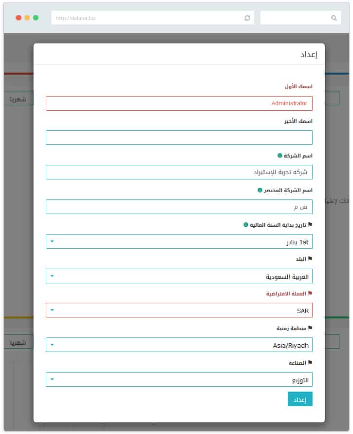 بعد دخولك على حسابك سوف تظهر أمامك شاشة يطلب منك تعبئة بعض البيانات الاساسية للشركة، قم بملء البيانات المطلوبة ثم اختر الاختصار الذي تريد استخدامه لشركتك ، الاختصار الذي تم اختياره هنا سوف يظهر لتمييز حسابات شركتك عن اى شركة اخرى داخل النظام .