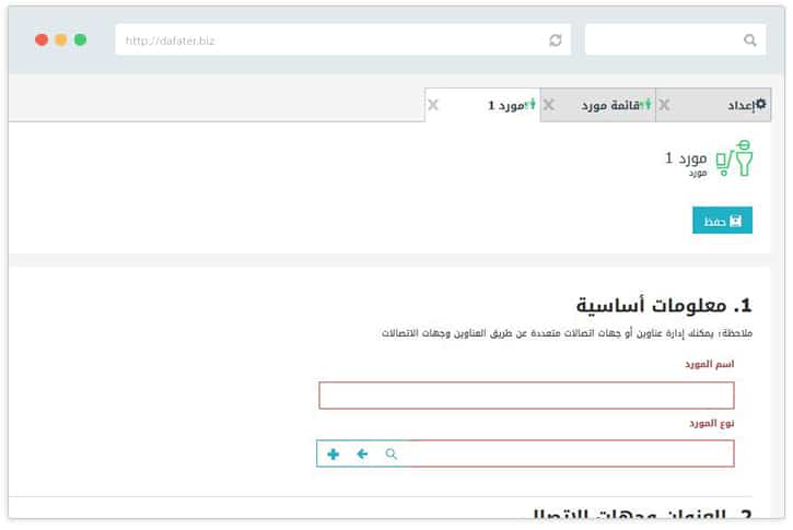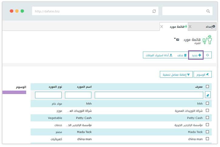 الموردين هم شركات أو أفراد يُمدونك بمنتجات أو خدمات. وهم يعاملون بالطريقة نفسها التي يعامل بها العملاء في نظام قوة. قم بعمل سجل جديد من + جديد (مورد).