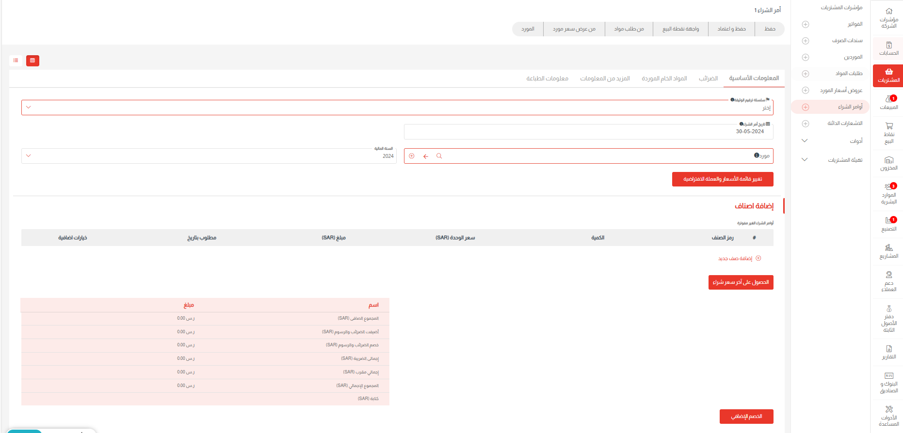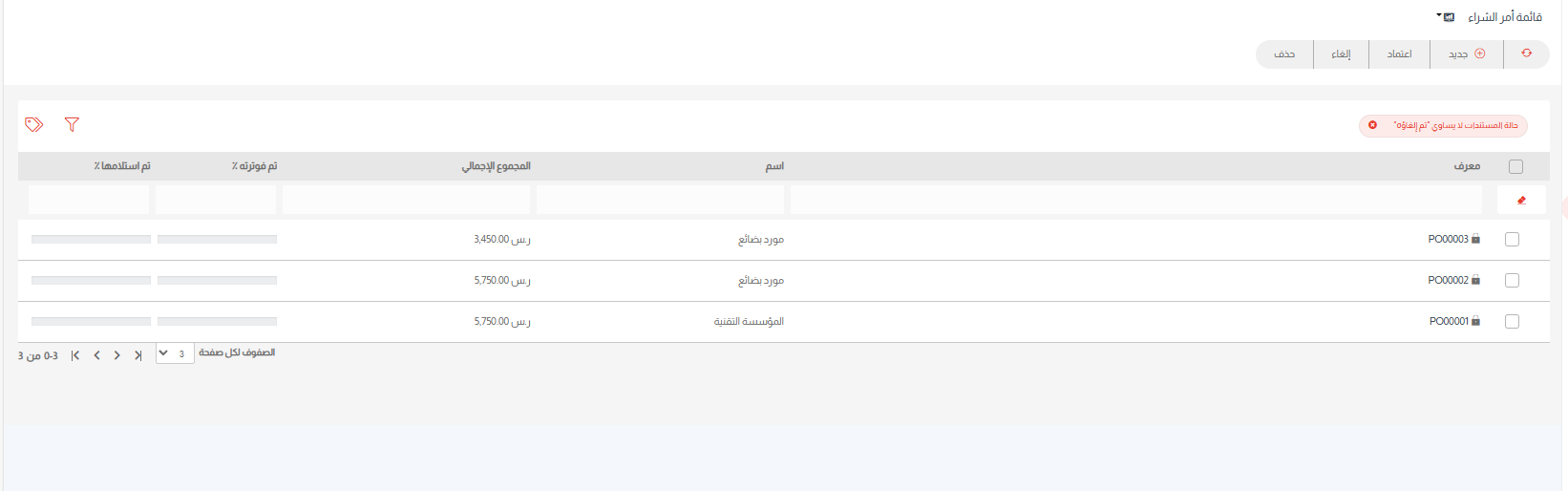 للقيام بإنشاء “أمر شراء“، اذهب إلى صفحة دفتر الشراء واضغط على “أمر شراء“.