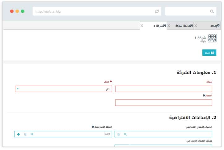 أدخل معلومات الشركة لاستكمال إعدادات الشركة. أشر إلى نوع الأعمال التجارية التي تمارسها تحت بند المجال. يمكنك إدخال: الصناعة التحويلية أو تجارة التجزئة أو مجال الخدمات اعتمادا على طبيعة النشاط التجاري الخاص بك. إذا كان لديك أكثر من شركة واحدة، ادخل معلومات الإعداد في صفحة إعدادات الشركة.
