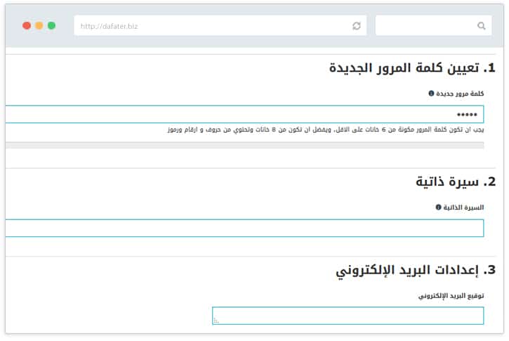 أدخال كلمة سر جديدة واختر صورة للمستخدم. اكتب وصفا مختصرا للمستخدم تحت عنوان سيرة ذاتية قصيرة (Short Bio).