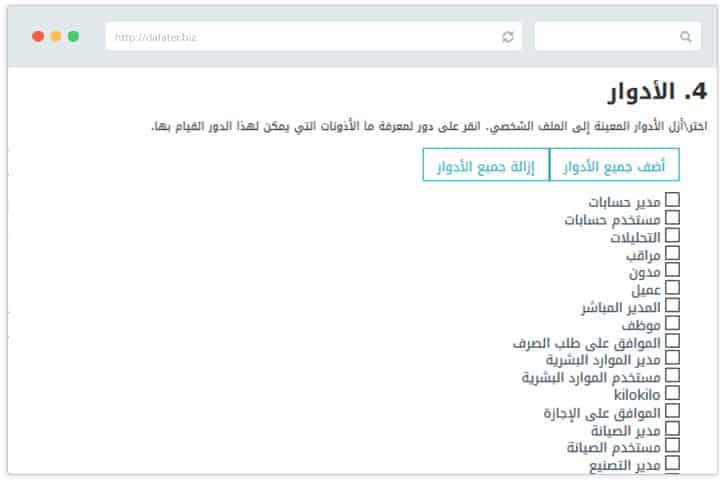حدد المربعات المقابلة للصلاحيات التي ستسمح بها لهذا المستخدم. يذكر أن نظام قوة يحوي مجموعة من الأدوار المحددة مسبقا. أدخل إعدادات بريده الإلكتروني وهي رسالة ستظهر في نهاية كل رسالة بريد الكتروني.