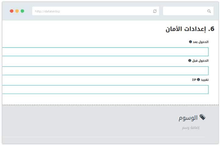 إذا كنت ترغب في إعطاء المستخدم الحق في تسجيل الدخول بالنظام خلال ساعات العمل ققط، أو خلال عطلة نهاية الأسبوع، أشر إلى هذا تحت بند إعدادات الأمان.