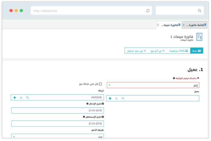 تاريخ الاستحقاق: التاريخ الذي تكون الدفعة فيه مستحقة (إذا كنت تبيع بالآجل). وهذا يمكن تعيينه تلقائيا من السجل الرئيسي للعملاء.